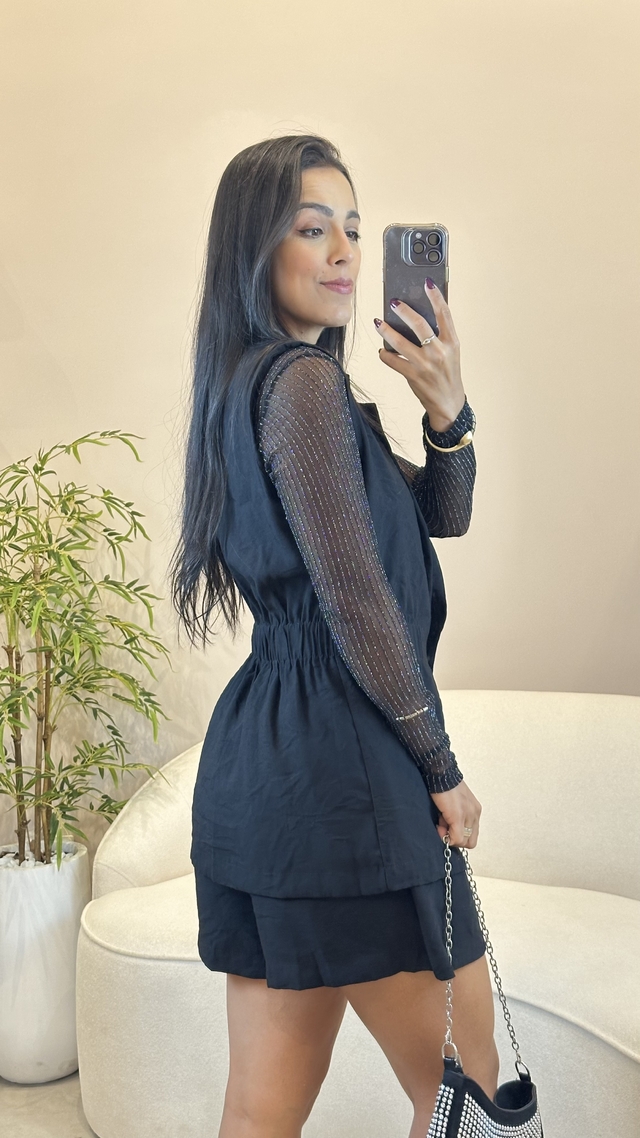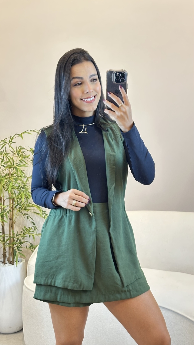 Conjunto em tecido alfaiataria marrant, super moderno e versátil! Colete possui elástico traseiro, para marcar a cintura, e fechamento frontal com botão. Short saia possui elastico na cintura, fechamento em zíper lateral.